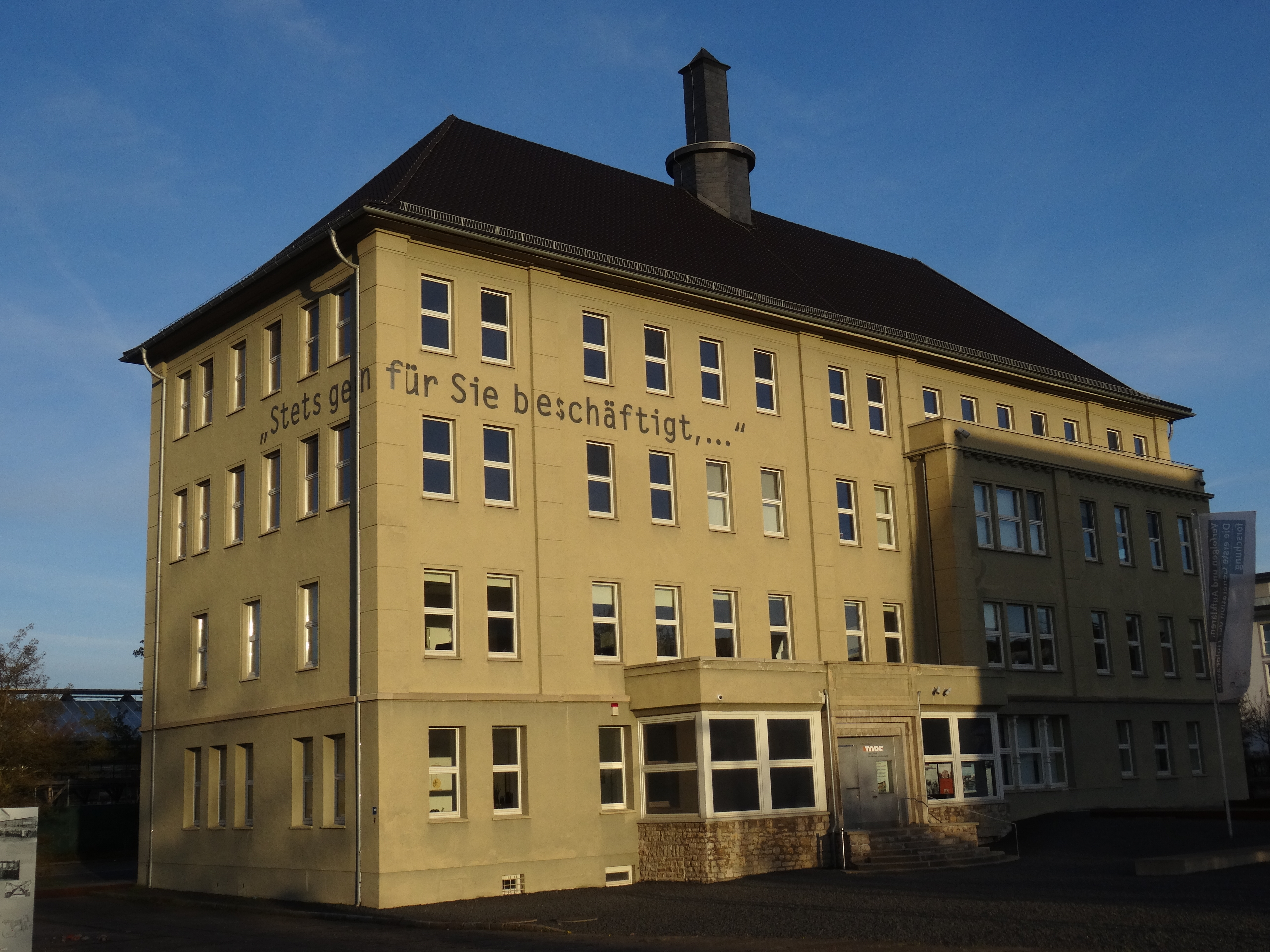 Der Slogan an der Außenwand des Gebäudes „Stets gern für Sie beschäftigt, …“ war die Schlusszeile in Briefen des Unternehmens an SS-Offiziere, die für die Vernichtungslager zuständig waren, und eine erschreckende Erinnerung daran, dass das Unternehmen bereitwillig am Völkermord an europäischen Juden, Sinti und Roma mitwirkte, indem es die industrielle Vernichtung von Menschenleben auf nichts weiter als Aufträge, Arbeit und technische Herausforderungen reduzierte.